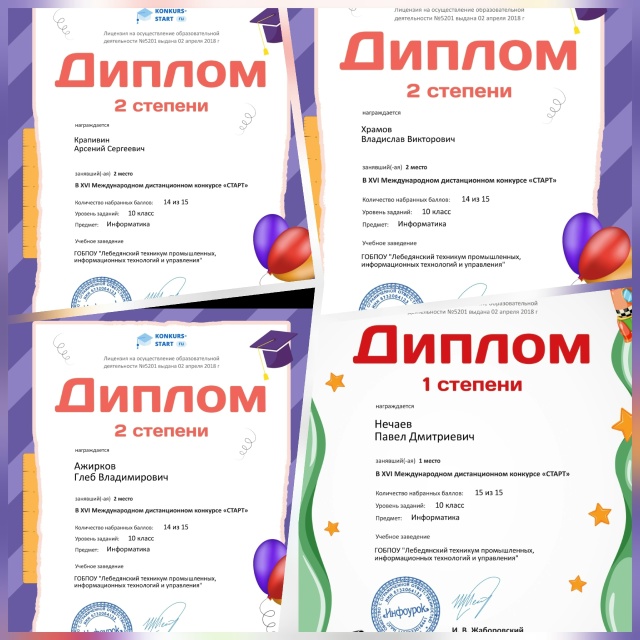 Студенты группы ИС-11 специальности Информационные системы и программирование приняли участие в XVI Международном дистанционном конкурсе «СТАРТ» по предмету Информатика, под руководством Зеленевой Т.А., где показали отличные знания. Поздравляем победителей!!!